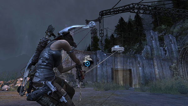 Exit the cabin, turn left and continue down the hallway. Lara overhears 2 of Mathias's men talking. Move forward and take out the first one in the doorway. The second is ahead and below, in the other section of the broken ship. Shoot him, pick up the arrows leaning against the support column, and then slide down the zip line.