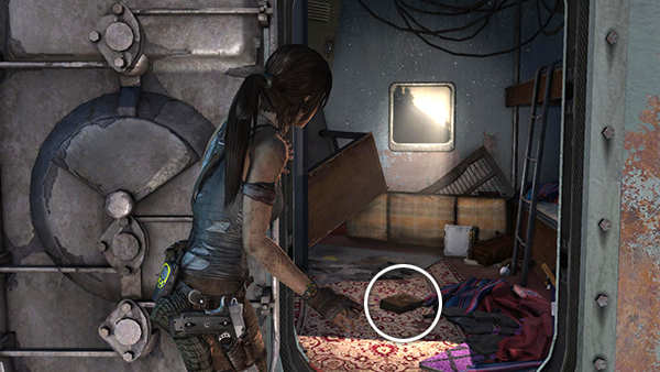 INSIDE THE ENDURANCE: Move forward through the debris-littered corridor. There's one open hatch on the left. This is Lara and Sam's cabin. As you approach, a brief cut scene plays, in which Lara finds a photo of herself and Sam at their graduation then catches a glimpse in the mirror of the person she has become. "So much has happened," she says. You receive 100 XP at this point.