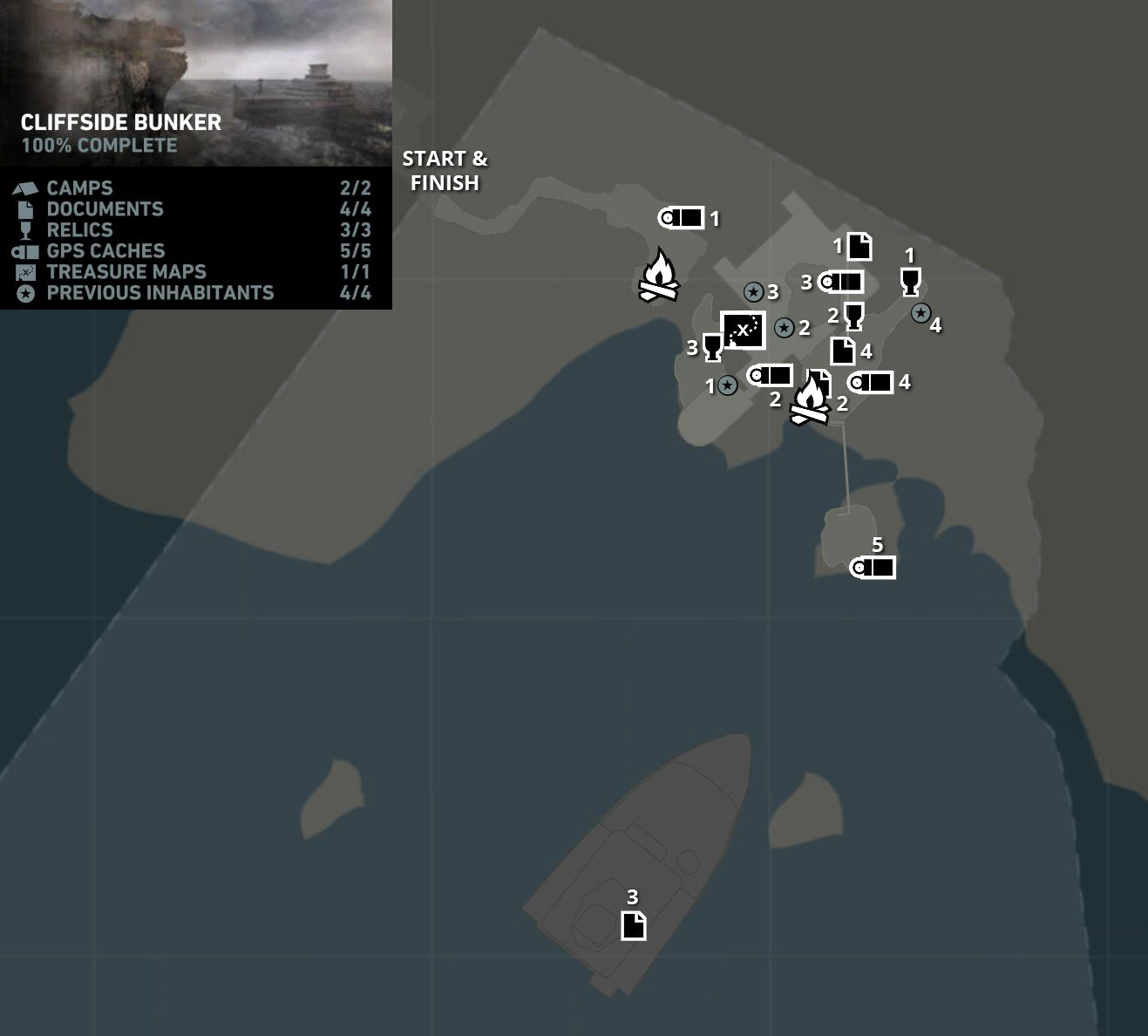 *There are collectibles but no fast travel camps in this area. If you don't get 100% on your first visit, it's still possible to return later. You'll need to fast travel to Shipwreck Beach and then make your way back to the Cliffside Bunker on foot. I've included a page with directions and screenshots.