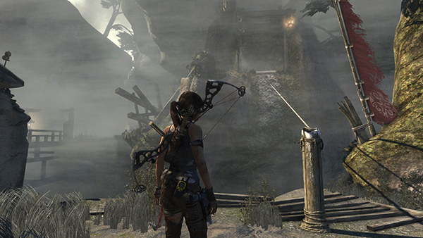 This time you enter the Mountain Pass level via the river, rather than the Mountain Village, as you did before. As Lara, Reyes and Jonah motor upstream on the PT boat, Lara explains her theory that the Sun Queen's trapped spirit is causing the storms. They all agree it sounds crazy, but right now crazy appears to be all they've got. When they arrive at the monastery, Lara asks her friends to guard the main entrance while she sneaks in to look for Sam. Lara climbs the cliffs to a point overlooking the chasm, and you receive 100 XP and a new goal.