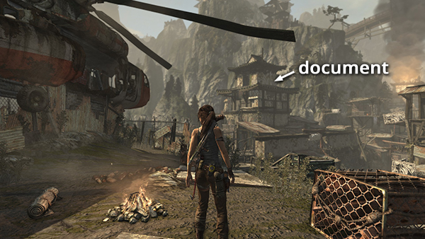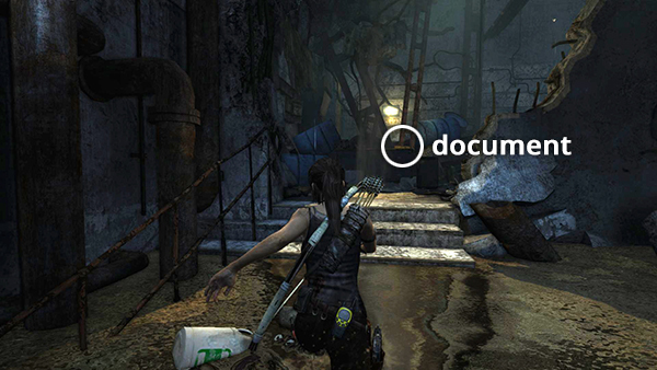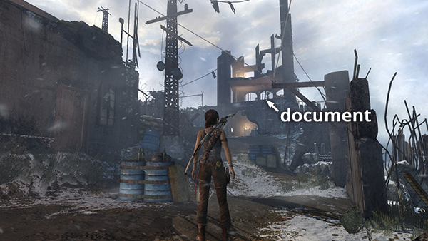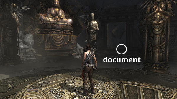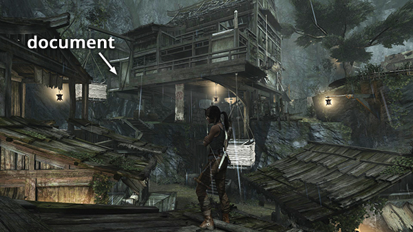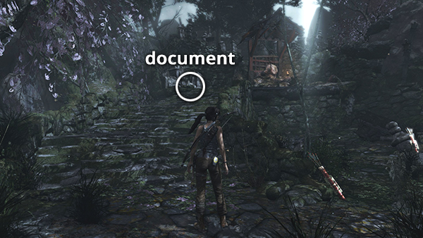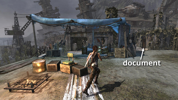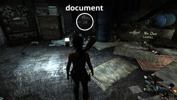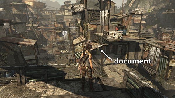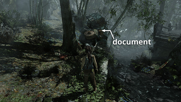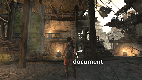 Unlike the other documents which appear in the game world as physical books which must be picked up and examined, Lara makes entries in her journal when she rests at various base camps. When she sits down at a camp, you'll hear her talking about what's going on. Afterward, these musings are stored in the Documents screen so you can review them. Lara's journals are not marked on the level maps and are not counted in the total number of documents on each level's map key.