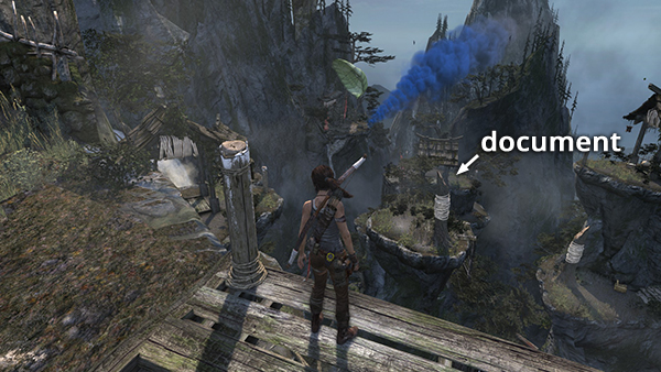 This is document #4 on the second visit map. It is located in the same general area as the one above: the canyon to the east of the village. This one is on the last rock column just before you cross the canyon to the smoke beacon. See here for details. (Click screenshot to enlarge.)