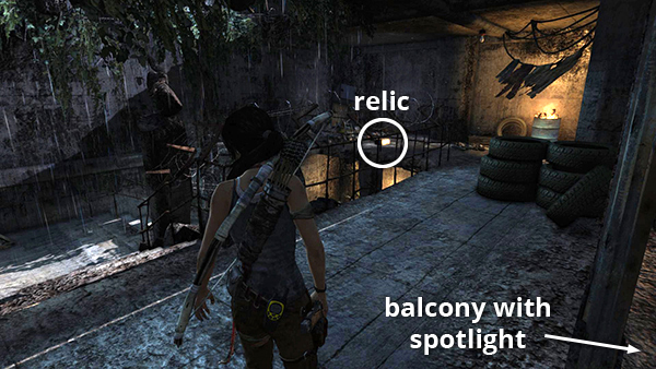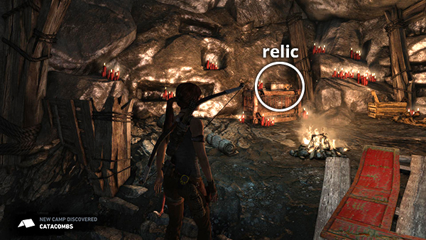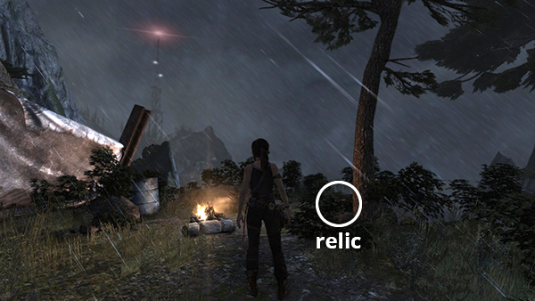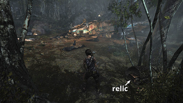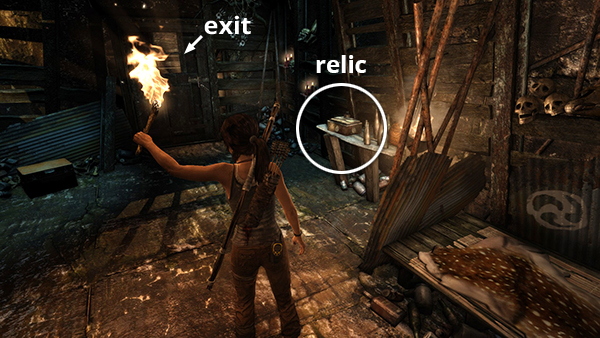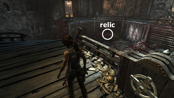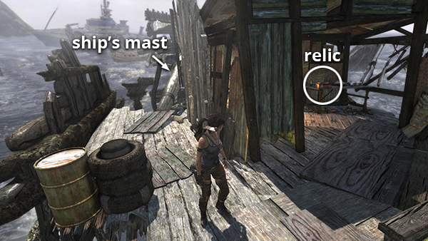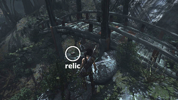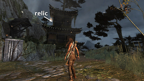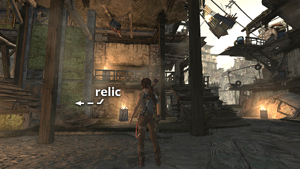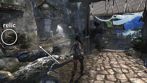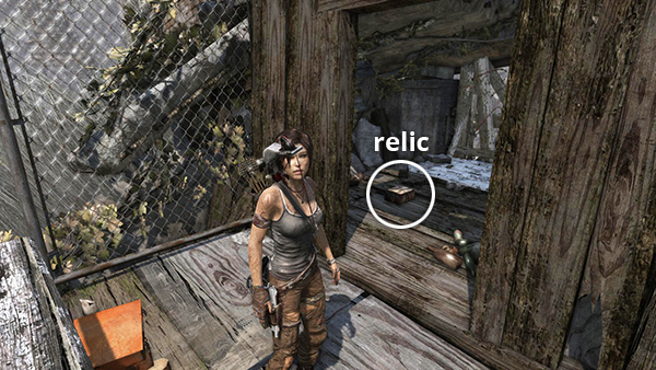 This relic is #3 on the second visit map. It is located in the wooden house below the Village Overlook Base Camp and is not accessible until the second visit to Mountain Village. See here for how to reach that area the first time or here for how to reach it after completing the Mountain Village level. (Click screenshot to enlarge.)