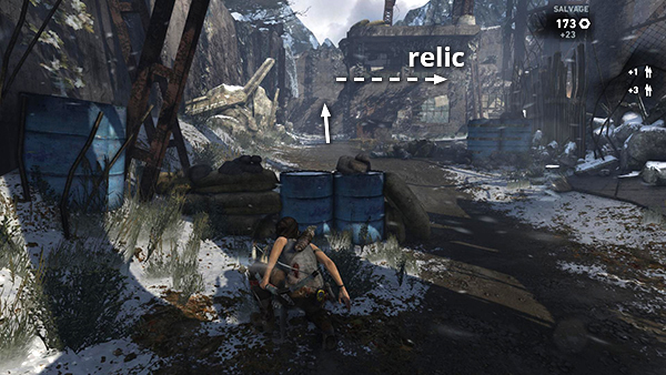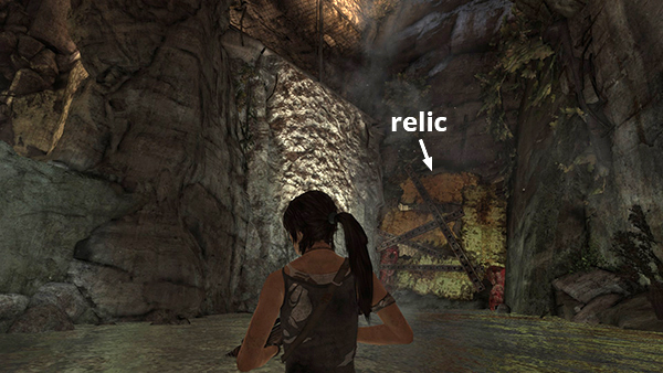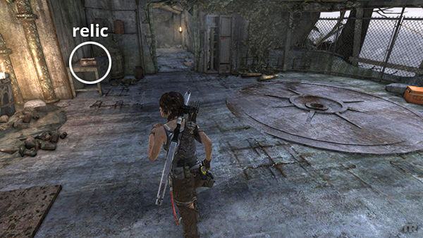 This is relic #1 on the level map. It's in the tunnel leading into the base from Shipwreck Beach. After climbing down to the stream bed, use explosive arrows or grenades to blow open the metal barriers and access the relic. See here for details. If you're out of grenades, see this tip in the Guide to 100% Completion. (Click screenshot to enlarge.)