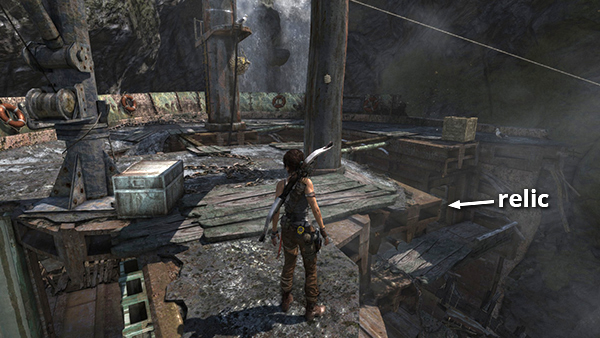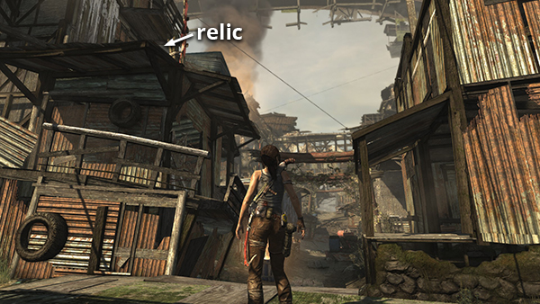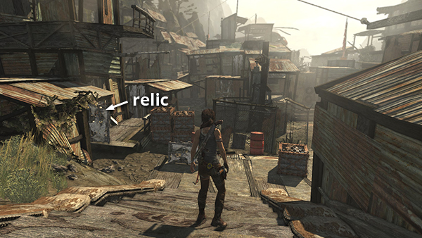 This is relic #2 on the part 1 map. It is found in one of the little shacks on the west side of Shantytown. As you leave the building containing the entrance to the Well of Tears Challenge Tomb, go down the steps and look for the shack on the left with a boarded-up doorway. Shoot out the planks and enter to find the relic. See here for details. (Click screenshot to enlarge.)