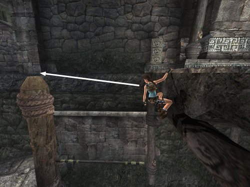NOTE: If Lara won't grab the stone handhold in the section above, try running along the chunk of rock diagonally and jumping to grab it. Or, skip the rock altogether and climb onto the stone base below the horizontal pole. Then jump straight up to grab the pole.