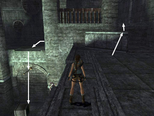 The quickest way down to the middle level is by diving into the pool, but first you must take a running jump across the jagged gap in the walkway connecting this alcove and the long perpendicular walkway ahead. To make this jump, run forward, jump right at the edge and hold down the Jump key to keep Lara in the air longer. Otherwise, she'll fall short and plummet to the stones below. (Alternatively, you can return along the wall the way you came and climb down the handholds below the ledge from which you pushed the first crate.)