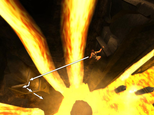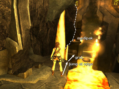 Be careful climbing back down to the lower handhold. Make sure you drop and hang from the middle of the ledge with the medipack, where the ledge is straight and even (at the spot indicated by the double-pointed arrow in the screenshot above); otherwise Lara can miss the grab and fall into the lava.