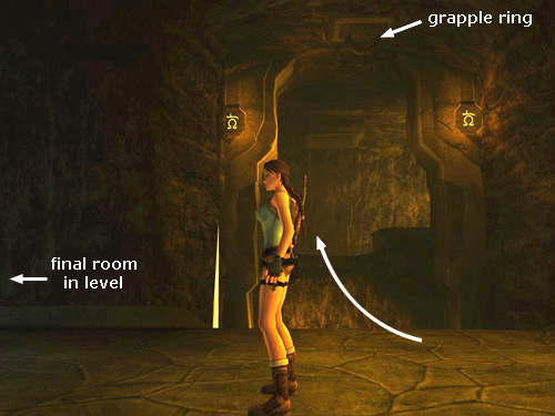 Return to the ledge above the ladder the way you came, except that you won't need to grapple-swing across on the way back. Lara can make it using a running jump, as long as you hold down the Jump key.