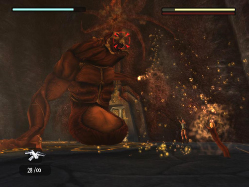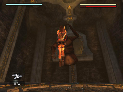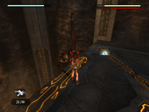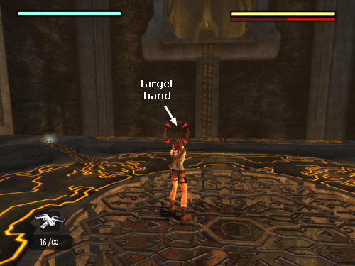 As you shoot, the mutant pounds its right hand on the floor, causing a series of tremors. If you jump just before each pound, Lara won't be knocked over.