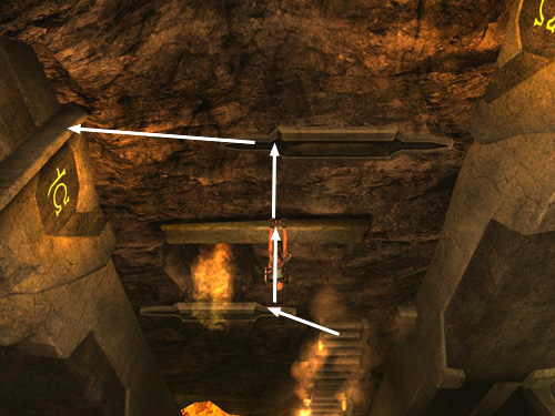 Fireballs periodically fall from above, but as long as Lara is hanging onto the ladder and not leaning outward, they won't touch her. Climb to the top and jump to grab the edge of the steam vent to the left. Stay as far to the right as possible to avoid the steam. Now watch the hole above on the right. When it stops belching fire, quickly jump up to grab the ledge above and move to the right just a bit to avoid the next puff of fire. Position Lara just below the left edge of the steam vent above and jump up to grab it. Then jump to the left to grab the handhold above the glowing glyph.