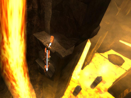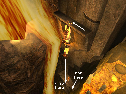 From there, jump back to grab one of the handholds on the square column beyond the double lava falls. Take care not to jump too close to the falls. The middle of this small ledge is a good take-off point. Climb around the corner to the right and drop down twice to reach the ledge below.
