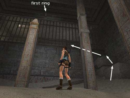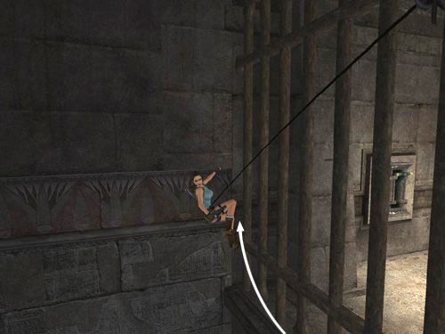 From the top step, where you got the medipack, take a running jump and grapple the metal ring high on the wall with the barred window. Lengthen the cable if necessary so Lara is hanging about halfway between the barred window and the ground. Then wall run back and forth to build up a good, long arc.