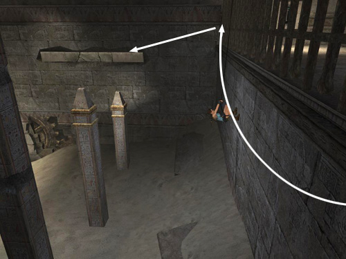 When Lara runs all the way to the left corners, jump back to grab the handhold on the wall behind and to the left.