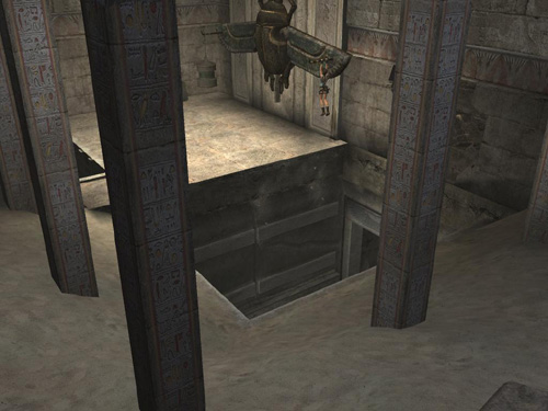 Lara's weight pulls it down, activating the mechanism, which opens the trapdoor in the floor, dumping a huge pile of sand into the ROOM WITH TWO RAISED OPENINGS below.