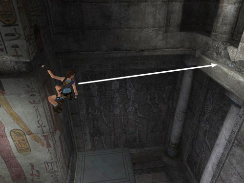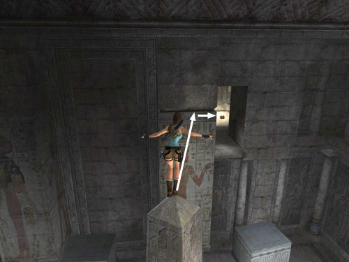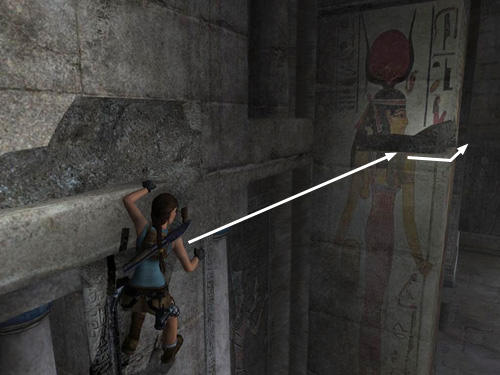 Climb to the right and jump to grab the horizontal crack in the next painted column. Climb around to the right so Lara's back is facing out toward the middle of the room.