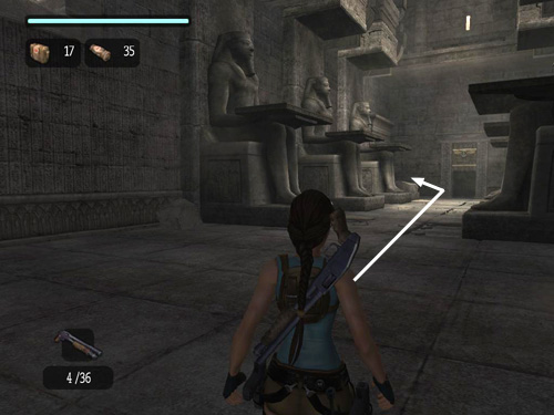 Quickly pull up, tap the HUD key if necessary to center the camera behind Lara, then run across the ledge and jump to grab the next one on the right side of the aisle. Pull up, turn left and take a running jump across the center aisle to the middle ledge on the other side.