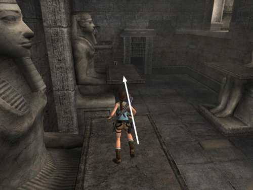 Pull the switch to move the statues together. Immediately turn and run between them back toward the entrance.