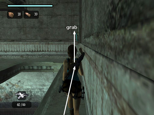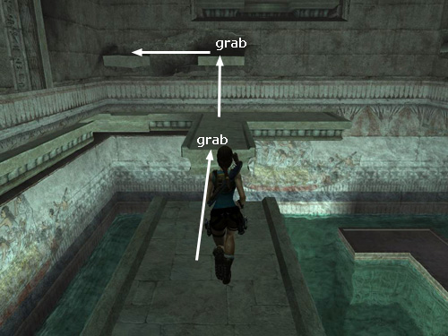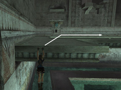 This ledge starts to retract into the wall as soon as Lara grabs it. So quickly pull up onto it (it may help to tap the HUD key in order to center the camera behind Lara first) and run to the right along the part of the ledge that juts out over the pool. (As with the other method, taking running jumps as you go may be helpful because the ledge then retracts more slowly, but don't bother if it makes it harder to control Lara.)