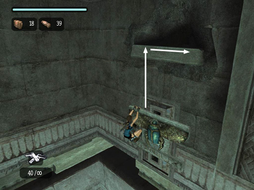 This ledge starts to retract, so quickly move the camera behind Lara and run along next to the wall and jump near the end of the ledge to grab the scarab switch on the wall beyond.