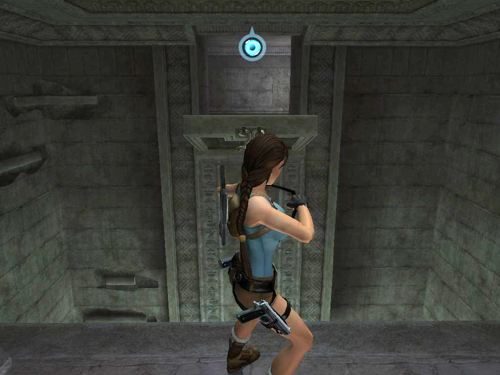 Turn to face out over the room. Notice the two metal rings: one on the ceiling, one on the far wall. Stand with Lara's back toward the barred opening just a step or so away from the edge of the ledge overlooking the room. Grapple the second ring—Lara should do this automatically, but you can use manual aim if necessary—and pull to lower a drawbridge-style ledge. Keep pulling on the cable until the ledge comes all the way down.