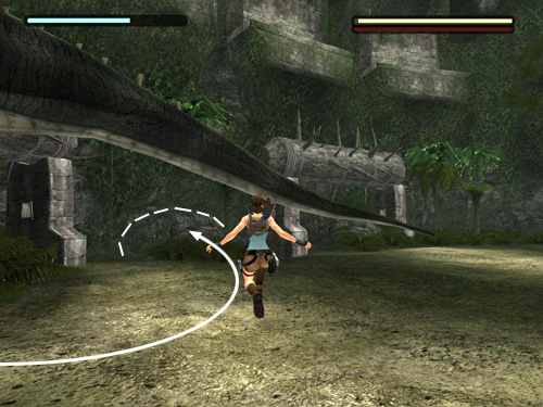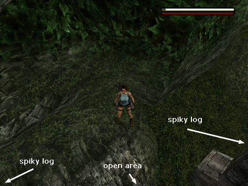 Instead, start by luring the T. rex away from the safe spot. What worked best for me was to run for the spiked log to the left of the safe spot (i.e., to the right if Lara's back is toward the two spiked logs, as shown in the screenshot above). If possible, shoot at the T. rex as you go until it becomes enraged (as described in the main walkthrough). Wait for the dinosaur to charge and then dodge to the left (i.e., toward the safe boulder).