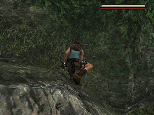 Move into the little depression where the boulder meets the cave wall. It may help to crouch down, as shown above. You can then shift the camera to look outward and see what the T. rex is doing. Hopefully he will have lost interest in Lara and just stand around thinking reptilian thoughts. If he's going to attack, he'll do it fairly quickly. If not, then you'll know it's safe to stand up and take aim.
