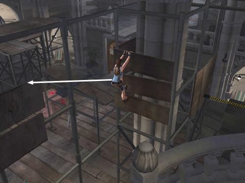 Jump back to grab the boards attached to the scaffolding behind and to the left. (These boards face the curved balcony.)