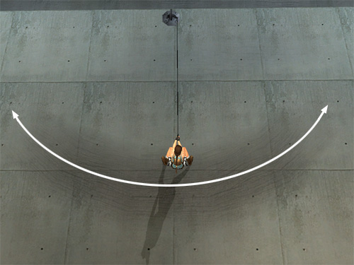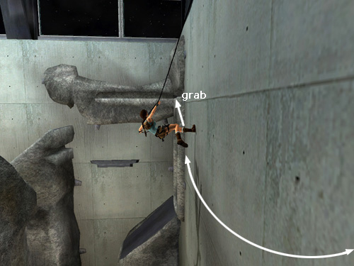 Once she gets going, you can release the camera control and let it follow along behind Lara. Each time she runs left or right, she'll go a little higher, until finally she's tracing out a long arc. (The marks on the wall indicate where she may have done this before.) When the left end of the arc is nearly as high as the stone ledge in the corner (as shown in the screenshot above), press Left + Jump and she'll retract the cable and jump to grab that ledge.