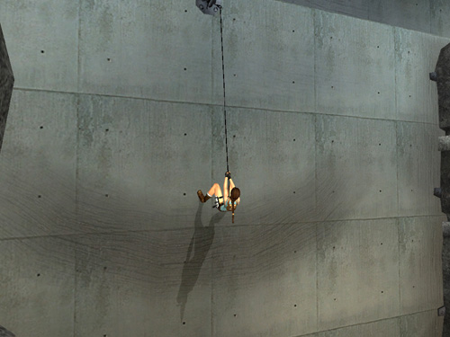 This time, once you get Lara hanging from the grapple cable, climb up or down the cable if necessary (hold Interact and press Forward/Back direction keys) so Lara's feet are just above the wear marks on the wall.