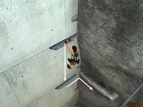 Drop and grab the metal handhold below. Then climb to the right . . .