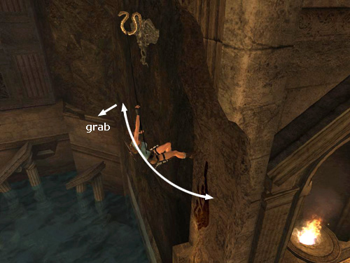Climb to the right and then jump to grab the next handhold. Jump up to grab the one above. From there, jump back to land at the top of the next slope. Immediately jump forward to grab the horizontal pole. (Don't let Lara slide here or she'll miss the pole.)