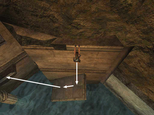NOTE: If you're playing the PC version of the game, you can probably skip the handhold and jump from the vertical beam directly to the slope, as indicated by the broken arrow in the screenshot above. This doesn't seem to work in the PS2 game.