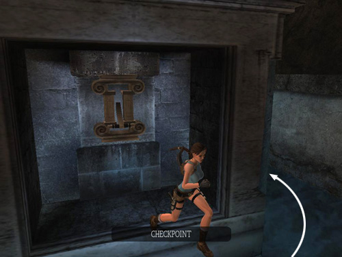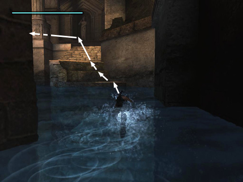 Stay close to the right wall, swim on the surface and tap Interact repeatedly to make Lara swim faster. When you reach the ledge, climb out, jump up the steps and run around to the entrance. (If you draw your pistols as soon as Lara climbs out of the water, you can jump up both steps in one bound, saving a little time. Just be sure to holster them after that.)