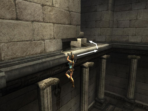. . . to grab the protruding ledge. It begins to retract as soon as Lara grabs it, so quickly pull up.