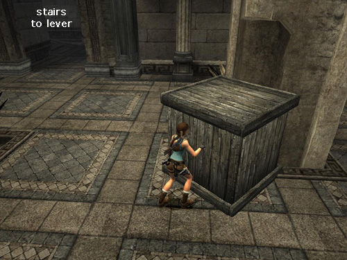 First go the top of the stairs and pull the lever to extend the columns. Then return downstairs and pull/push the wooden crate out of the stairwell and into the big room. Position it against the base of the angled column nearest the alcove containing the RELIC, as shown above. Later, when the column descends, the notch in its corner will catch on the crate, preventing the column from descending all the way.