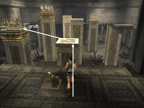 Turn right and take a running jump to grab the spiked pillar ahead. Lara may grab the top of the pillar but if she misses and grabs the horizontal crevice partway down, just jump up to grab the top.