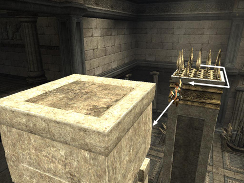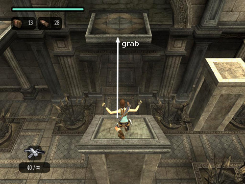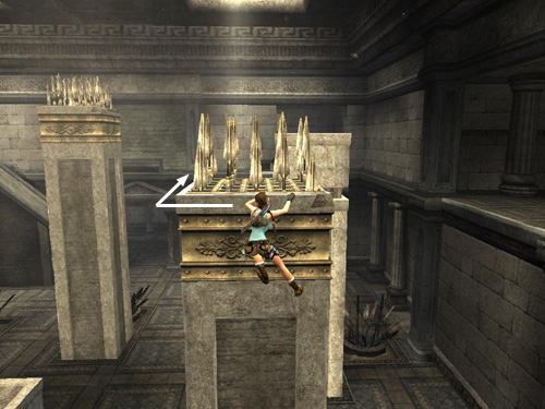 . . . to land on the flat-topped pillar behind. It starts to descend, so tap the HUD key to center the camera behind Lara. Then immediately run forward and jump at the edge to land on the sloping pillar ahead.