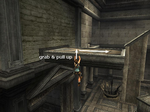 . . . to grab the protruding ledge. It begins to retract as soon as Lara grabs it, so quickly pull up.