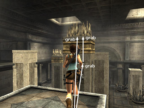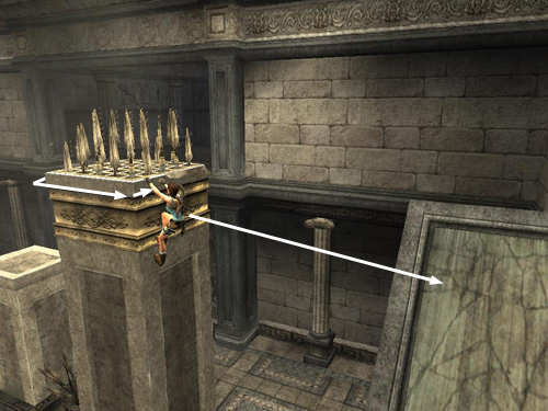 Turn right and take a running jump to grab the spiked pillar ahead. Lara may grab the top of the pillar but if she misses and grabs the horizontal crevice partway down, just jump up to grab the top.