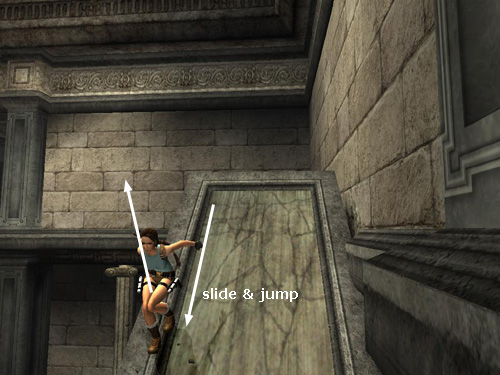 . . . to land on the flat-topped pillar behind. It starts to descend, so tap the HUD key to center the camera behind Lara. Then immediately run forward and jump at the edge to land on the sloping pillar ahead.