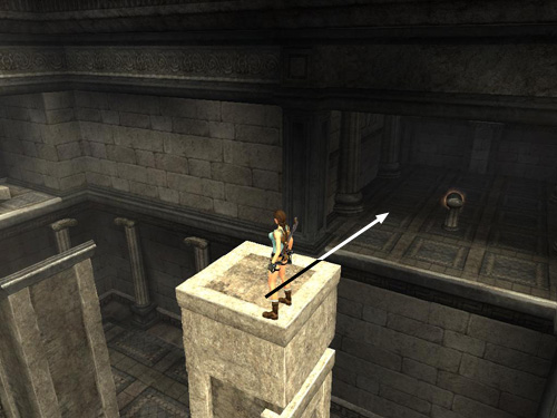 Position Lara as close to the left edge as she'll go. Jump back to grab the narrow horizontal shelf on the pillar behind.