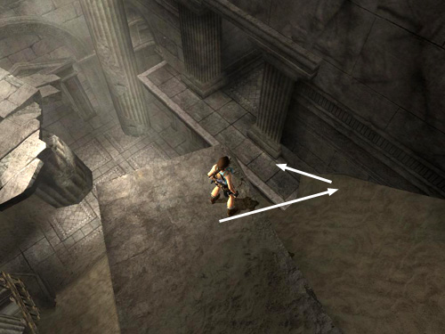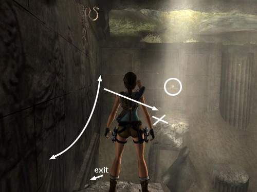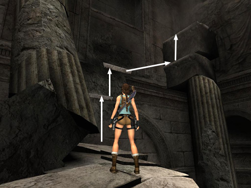 Jump to grab the crack on the right side of the center column. Climb around to the right and jump back to land on the flat spot behind. Cross the broken floor to the left wall and grab the lower handhold.