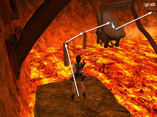 If Lara is too far to the left or right before swinging around the bar, she'll miss the next grab and fall into the lava. So adjust her position so she's hanging directly in front of the nearest corner of the ramp (as shown above). Swing around the bar, jump onto the ramp, slide just a little bit and jump to grab a handhold on the support pillar ahead.
