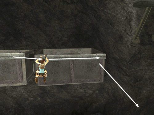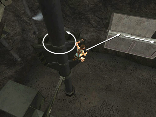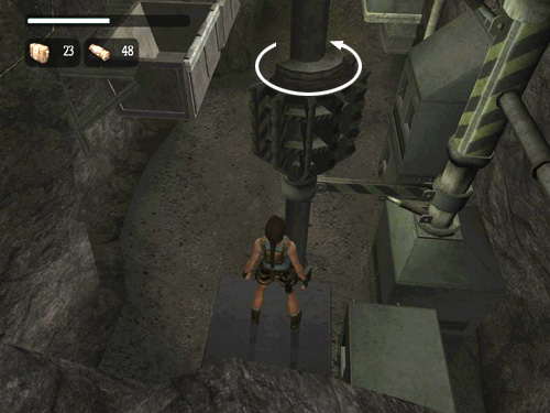Be careful as you maneuver around the small platform. The camera is hard to control and it's easy to step off the edge by mistake. Point the camera out across the pit and watch the rotating piece of machinery ahead. When it turns so the flat side is facing Lara, jump and grab onto the right side of it.