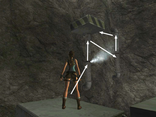 Turn to face the two vertical pipes on the shorter wall ahead. The steam escaping from these pipes will injure Lara, so try to minimize her exposure. Wait until the steam stops venting from the first pipe and take a running jump to grab it. Climb up as far as you can, move the camera to the left so it point at the first vertical pipe and the second pipe is directly ahead beyond the first. When the steam escaping from the second pipe subsides, jump forward to grab it. Climb as high as you can, keeping the camera behind Lara, and then jump back to grab the small square platform above the first pipe. Quickly pull up before the steam from the first pipe burns her.