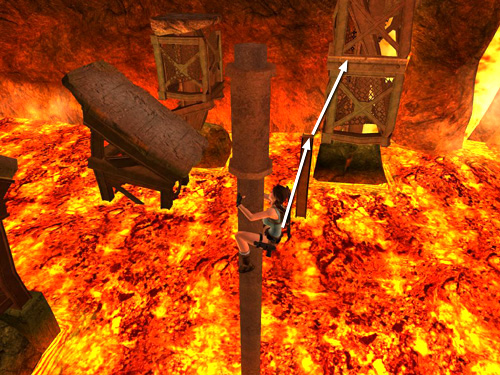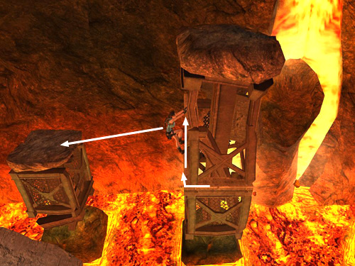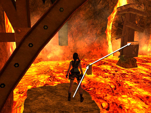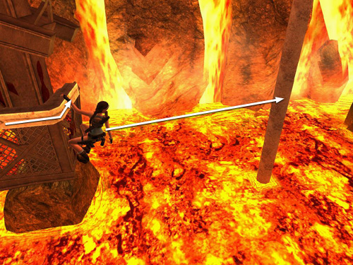 From the broken tracks jutting out above the lava, take a running jump to the broken support column ahead on the left.