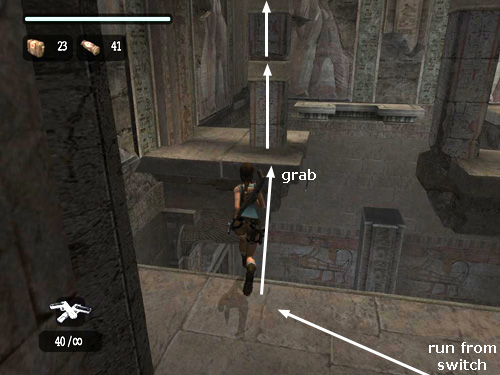 IMPORTANT: If Lara dies during the second phase of the run, the game will reload at CHECKPOINT 6; however, the pole above will have retracted into the wall. If this happens, just hang from the edge of the long ledge with the checkpoint and drop to land on the ledge with the switch. Then you can pull it and try again. If you reach CHECKPOINT 6 and you feel you've taken too much time, you can save the game manually, reload and drop down to the switch to try again, as shown in the screenshot below.