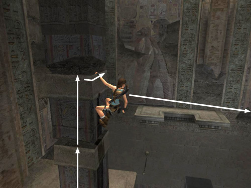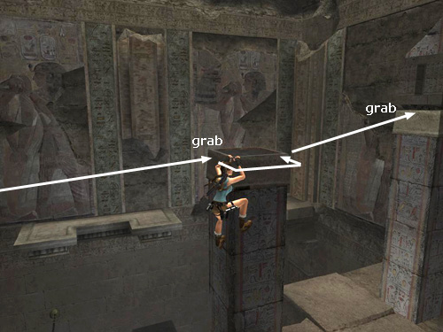 After pulling the switch and waiting for the cut scene to finish, run to the opposite side the ledge. Keep running as you veer to the right, jump off the ledge and grab the left side of the long, broken ledge in the middle of the room. Pull up, grab the lower handhold on the square pillar ahead then jump to grab the higher handhold.