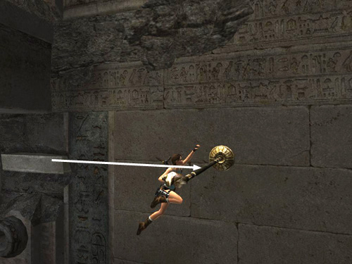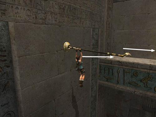 Swing and jump to the long ledge ahead. You don't actually need to swing all the way around the pole. It's quicker to just grab it and then press Jump again to leap off the pole before Lara swings all the way around it.